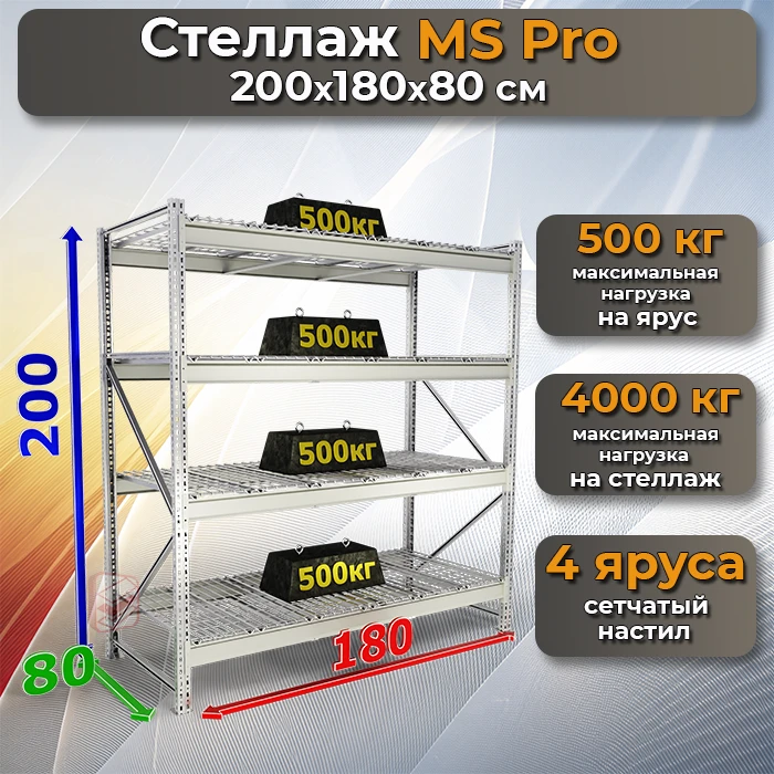 Складской стеллаж сетчатый настил MS Pro 200х180х80 4 полки