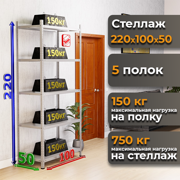 Стеллаж высотой 220 см, шириной 100 см, глубиной 50 см, с пятью полками с максимальной нагрузкой до 150 кг.