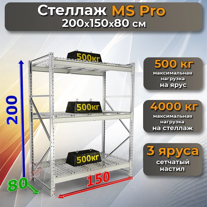 –Стеллаж складской MS Pro 200х150х80 3 сетчатых полки
